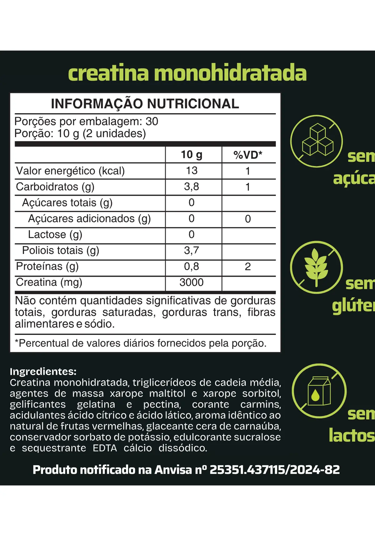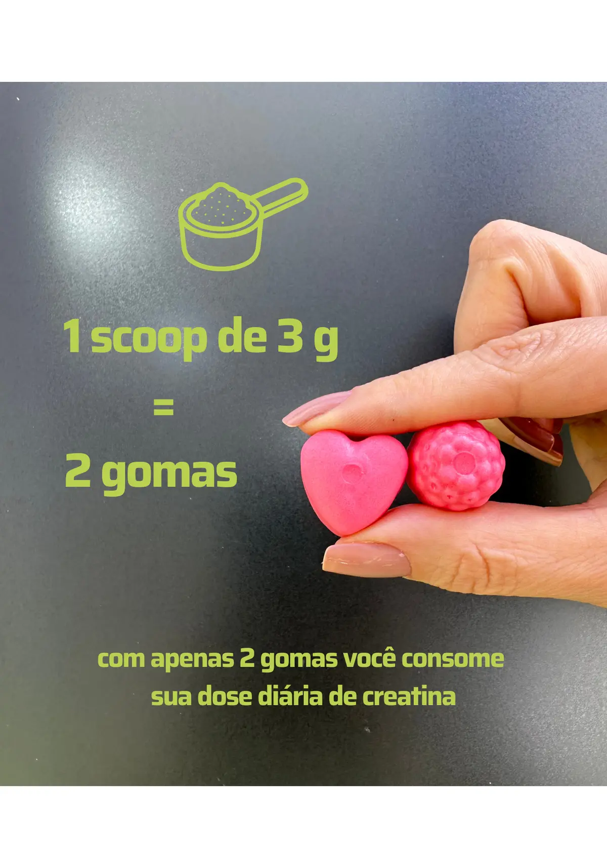 Com duas gomas você obtém 3 gramas de creatina, garantindo 30 doses por frasco.