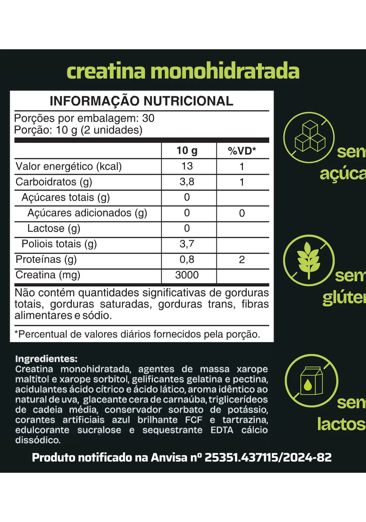 Com duas gomas você obtém 3 gramas de creatina, garantindo 30 doses por frasco.